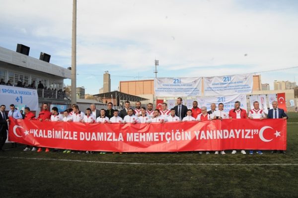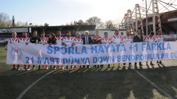 İki takım da sahaya üzerinde “Kalbimizle Dualarımızla Mehmetçiğin Yanındayız” ve “Sporla Hayata +1 Farkla 21 Mart Dünya Down Sendromlular Günü Kutlu Olsun” yazılı pankartlarla çıktı.
