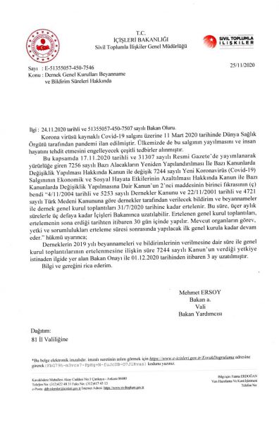 Dernek Genel Kurul Toplantıları, Bildirim ve Beyannamelerinin Covid-19 salgınının devam etmesi sebebiyle 7244 sayılı Kanun’un 2’nci maddesinin (ç) bendinde 11.11.2020 tarihli ve 7256 sayılı Kanunla yapılan değişikliğe istinaden derneklerin beyanname ve bildirimlerinin verilmesi ile genel kurul toplantılarının ertelenmesine ilişkin süre Bakanlık Makamının 24.11.2020 tarihli ve E.7507 sayılı Oluru ile 28.02.2021 tarihine kadar ertelenmiştir.