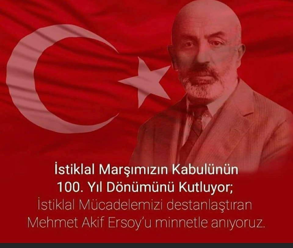 İstiklal Marşı’nın kabul edilişinin 100. yılında, Türk milletinin bağımsızlık aşkını, vatan sevdasını, imkânsızlıklar içerisinde destansı bir mücadeleyle yeşerttiği Devletini mısralara dökerek bizlere ölümsüz bir rehber bırakan büyük şair Mehmet Akif Ersoy başta olmak üzere, istiklal mücadelemizin tüm kahramanlarını saygı, rahmet ve minnetle anıyoruz. Mehmet Akif Ersoy´un dediği gibi, “Allah bir daha bu millete İstiklal Marşı yazdırmasın!”