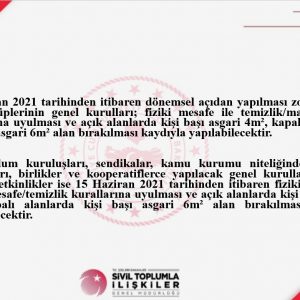 İçişleri Bakanlığı’nın 01.06.2021 tarihli ve “Haziran Ayı Normalleşme Tedbirleri” konulu genelgesi ile Genel Kurulların yapılmasına ilişkin getirilen yeni düzenlemeler: 01 Haziran 2021 tarihinden itibaren dönemsel açıdan yapılması zorunlu olan spor Haberin Devamı