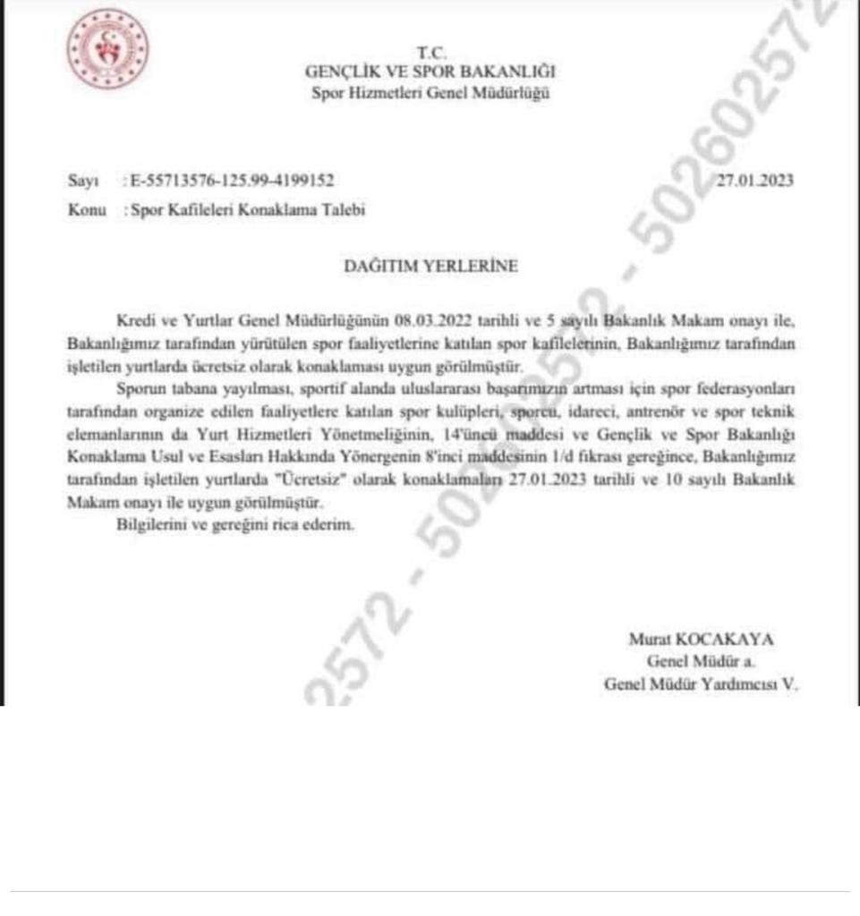 Spor Federasyonlarının organize ettiği faaliyetlere katılım sağlayan spor kulüpleri, sporcular, idareciler, antrenörler ve spor teknik elemanlarının Bakanlığımız tarafından işletilen yurtlarda ücretsiz bir şekilde konaklamaları 27.01.2023 tarihli Bakanlık Makam Onayı ile uygun görüldü.