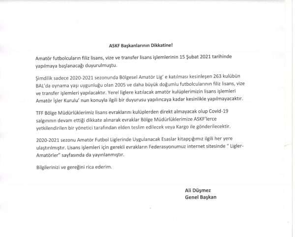 Amatör futbolcuların filiz lisans, vize ve transfer lisans işlemlerinin 15 Şubat 2021 tarihinde yapılmaya başlanacağı duyurulmuştu.